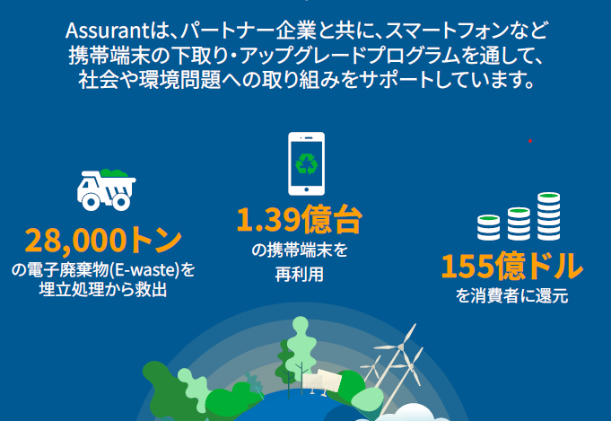 東京、2023年4月21日 - 世界中のお客様が購入した大切な製品をサポートし、守り、つなぐ革新的なソリューションを提供するビジネスサービス・カンパニーであるAssurant(NYSE: AIZ)は、携帯端末の下取り・アップグレード事業で、2009年からの累計で1億3,900万台の使用済みスマートフォン及び携帯端末をリユース・リサイクルへと転換し、700万トンのCO2排出、また2万8,000トンの電子廃棄物(E-waste)の埋立処理を回避したことを発表しました。